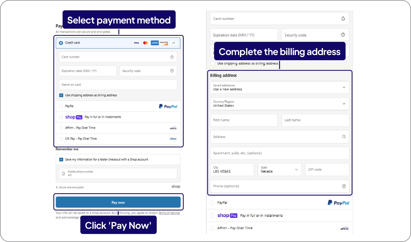 1. Select a payment method and click the 'Pay Now' to complete payment .
